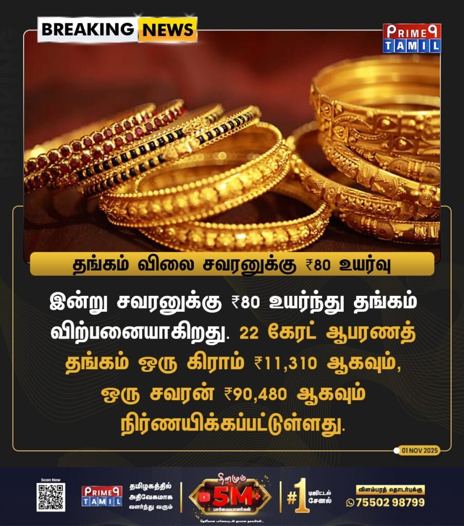 இன்று ( நவம்பர் 1 ) தங்கம் விலை கிராமுக்கு ரூ.10 வீதம், ஒரு பவுனுக்கு ரூ.80 உயர்ந்துள்ளது.