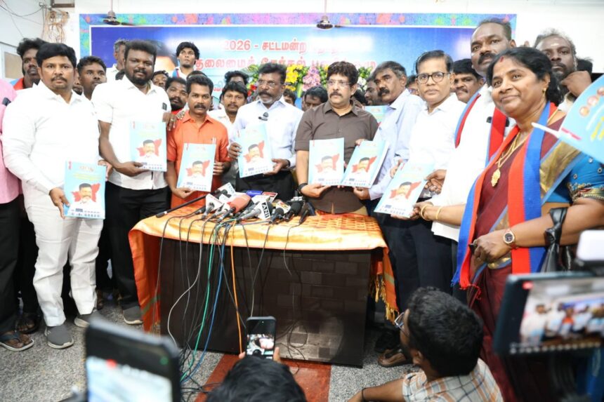 தமிழக சட்டமன்றத் தேர்தலுக்கான களம் சூடுபிடித்துள்ள நிலையில், விடுதலைச் சிறுத்தைகள் கட்சியின் (விசிக) தேர்தல் அறிக்கையை அக்கட்சியின் தலைவர் முனைவர் Thirumavalavan இன்று சென்னை அசோக் நகரில் உள்ள கட்சித் தலைமையகத்தில் வெளியிட்டார். சமூகம், கல்வி, பொருளாதாரம் மற்றும் மாநில உரிமைகளை முன்னிறுத்தி உருவாக்கப்பட்டுள்ள இந்த அறிக்கை, அரசியல் வட்டாரத்தில் பெரும் கவனத்தை ஈர்த்துள்ளது.