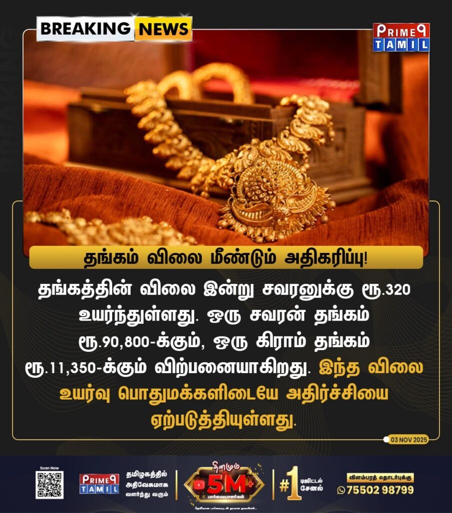 இன்று ( நவம்பர் 3 ) தங்கம் விலை கிராமுக்கு ரூ.40 வீதம், ஒரு பவுனுக்கு ரூ.320 உயர்ந்துள்ளது.